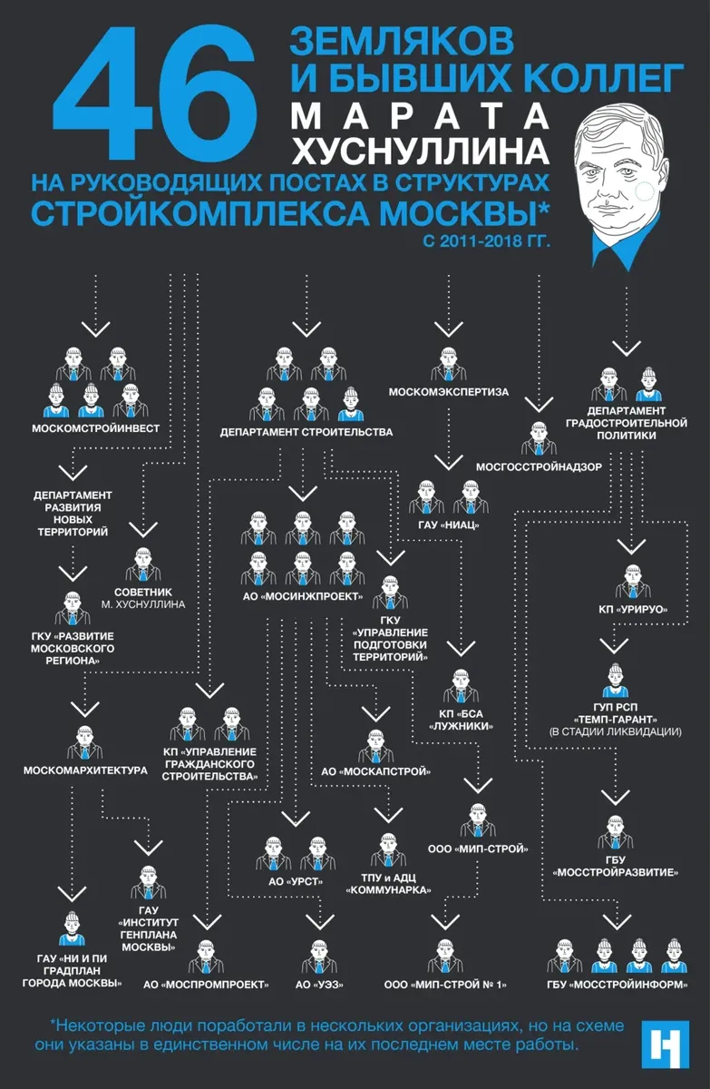 Мы обнаружили 46 земляков Хуснуллина, которые с 2011 года заняли руководящие посты (директора, заместители и начальники отделов) в 45 госучреждениях московского Стройкомплекса, подконтрольных ему ведомств и дочерних структур. Еще шесть его земляков трудоустроились в столичные департаменты финансов и городского имущества. Больше половины из них (28 из 52) можно назвать «командой Хуснуллина»: это его коллеги по работе в Татарстане или те, с кем он взаимодействовал как министр строительства республики.
