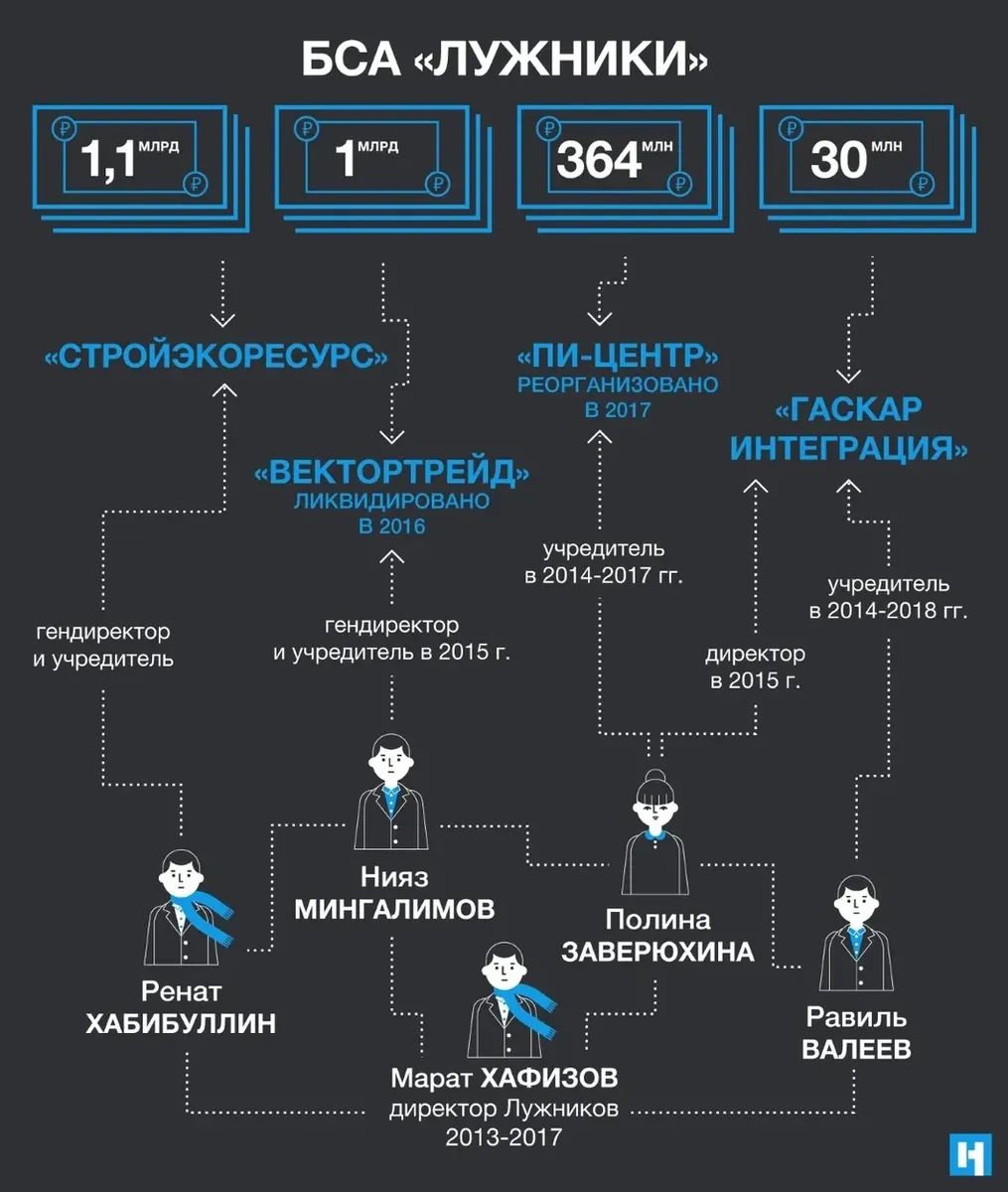 Еще 1 млрд рублей от «Лужников» получила компания «ВекторТрейд». Она даже конкурировала за эти контракты со «СтройЭкоРесурсом» Хабибуллина. При этом владелец «ВекторТрейда» Нияз Мингалимов, несомненно, мог быть знаком и с Хабибуллиным, и с Хафизовым. Судя по фотографиям в социальных сетях «Одноклассники», «ВКонтакте» и «Инстраграме», чиновники, бизнесмены, их супруги и близкие родственники дружат между собой.