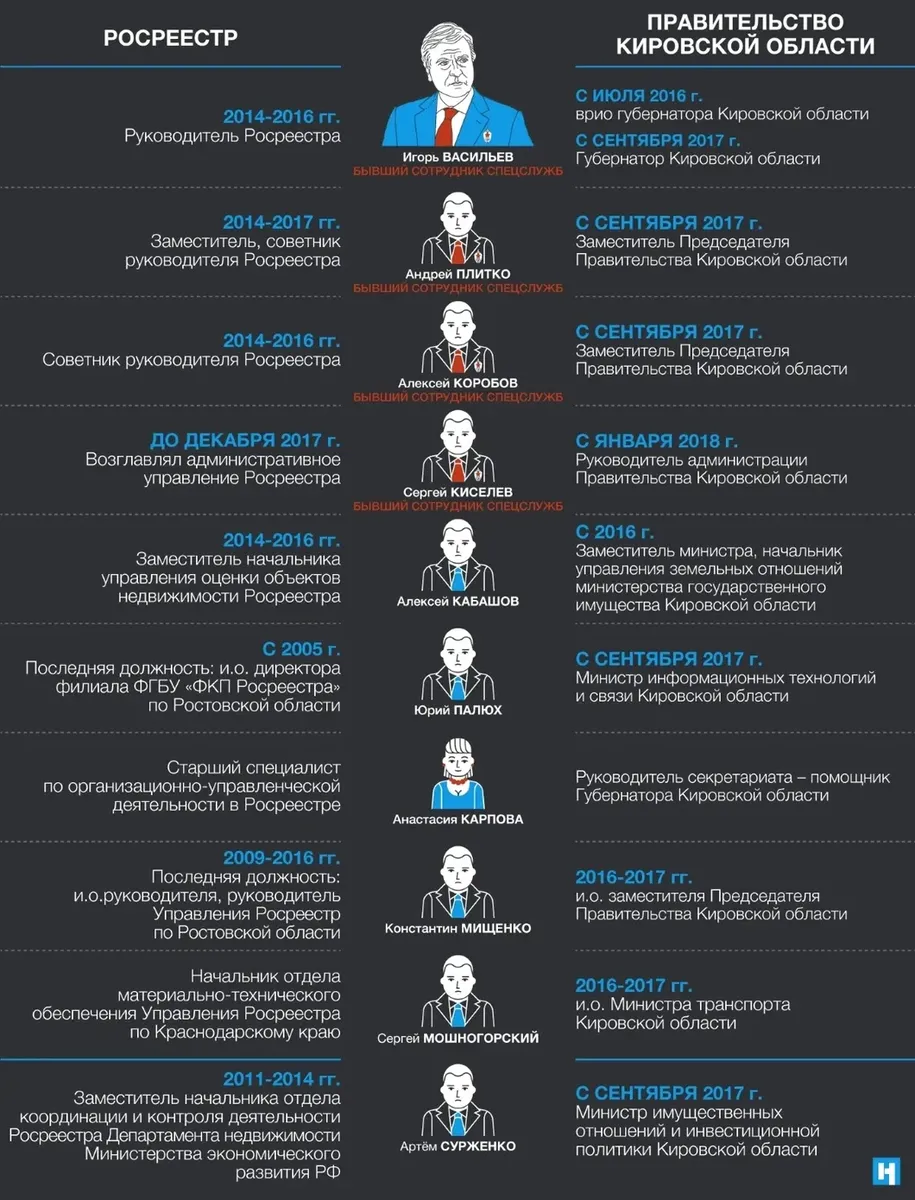 Летом 2016 года после ареста Никиты Белых исполнять обязанности губернатора президент отправил в Кировскую область Васильева. С ним Путин был знаком еще со времен работы в КГБ. В 2013 году Васильев, будучи аудитором Счетной палаты, подготовил доклад о потерях бюджета (24 млрд рублей) из-за нарушений в работе Росреестра и коррупционных сделок. В итоге в 2014 году Васильев сам возглавил Росреестр. Вместе с ним туда пришел еще один выходец из КГБ и коллега Васильева по двум предыдущим местам работы — в Совете Федерации и Счетной палате — Андрей Плитко.