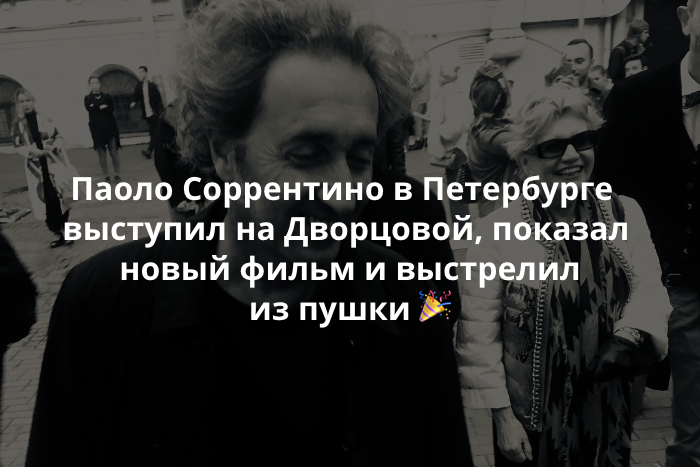 В эти выходные в Петербург приезжал итальянский режиссер Паоло Соррентино, снявший фильмы «Великая красота», «Молодость» и сериал «Молодой папа». На фестивале «Послание к человеку» Соррентино представил свой новый фильм «Лоро», встретился с поклонниками и даже выстрелил из пушки Петропавловской крепости.