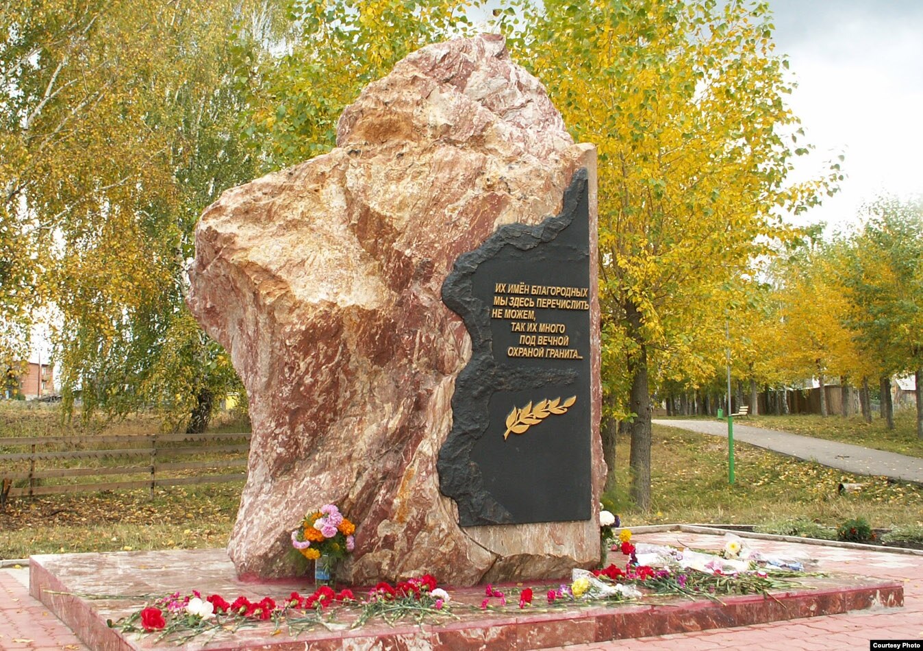 – Да, этот памятник мы посвятили нашим землякам – жертвам политических репрессий 1930–1950-х годов. Проект памятника разрабатывали восьмиклассники Первомайской школы, а сам камень был установлен 15 сентября 2006 года недалеко от православного Свято-Троицкого храма. Это не случайно, ведь среди репрессированных и расстрелянных было много священников и членов их семей. Мой сын исследовал биографию одного священника, Никиты Казакова, убитого за веру в 1929 году. Его работа называется "Вера превыше жизни: жизнь и гибель священника Михайло-Архангельской церкви села Туендат Никиты Акимовича Казакова и судьба его семьи".