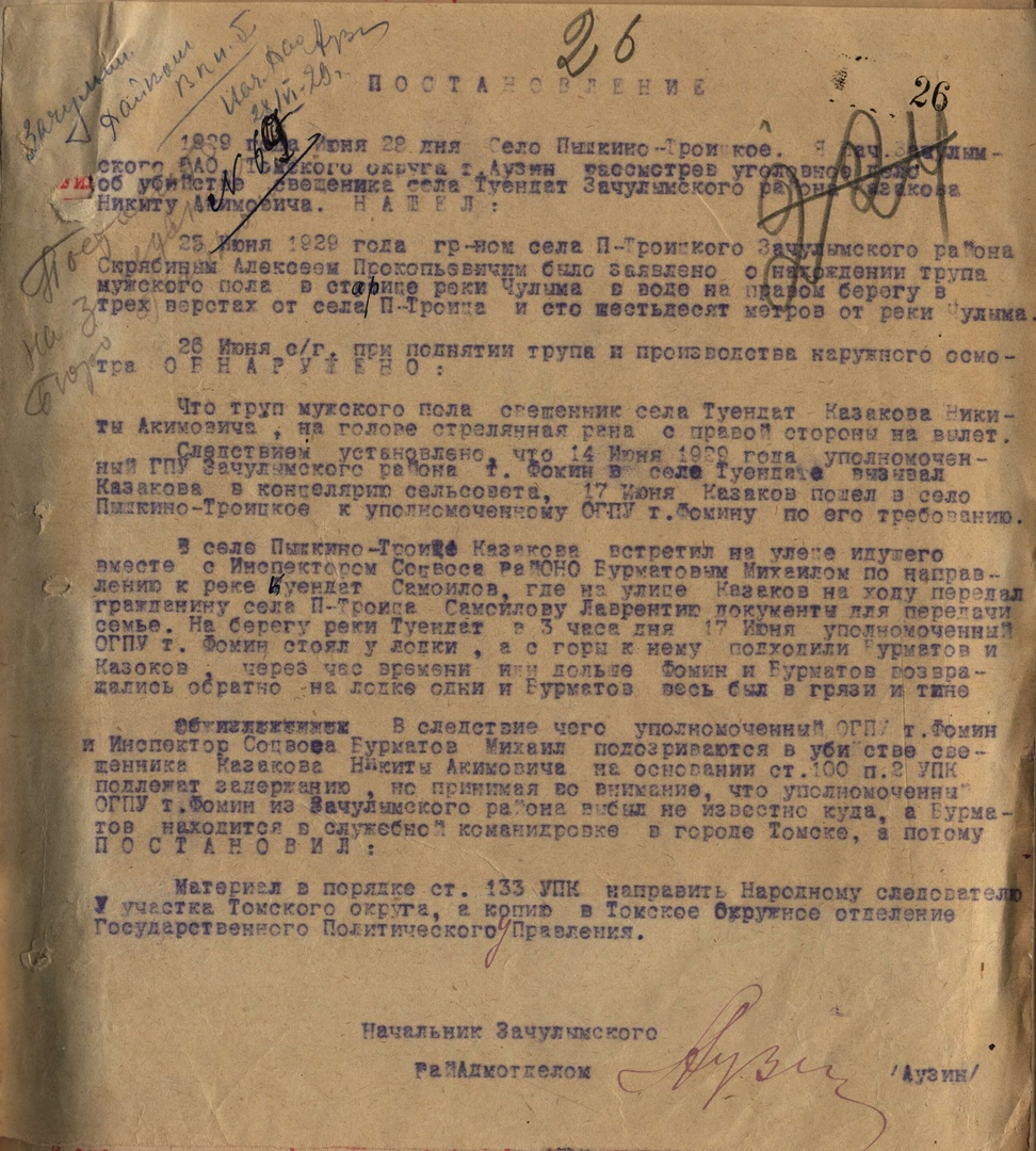 14 июня 1929 года священник Никита Казаков был вызван в село Туендат к уполномоченному ОГПУ Зачулымского района Фомину. 17 июня 1929 года в 15 часов дня Казаков вместе с Фоминым и инспектором социалистического воспитания Михаилом Бурматовым сели в лодку на речке Куендат. Фомин и Бурматов вернулись в село через час, но уже без священника. 26 июня крестьянин Алексей Скрябин нашел в старице реки Чулым труп мужчины. После его осмотра начальник Зачулымского Районного административного отдела Аузин определил, что это священник Никита Акимович Казаков. Опросив свидетелей, Аузин пришел к заключению, что убийство могли совершить Фомин и Бурматов, но исходя из того, что уполномоченный ОГПУ по Зачулымскому району Фомин "из Зачулымского района выбыл неизвестно куда, а Бурматов находится в служебной командировке в Томске", постановил дело в отношении подозреваемых в убийстве не возбуждать, а собранные материалы передать народному следователю 5-го участка Томского округа, копию – в Томское окружное отделение ГПУ. Судя по всему, на этом следствие и закончилось.