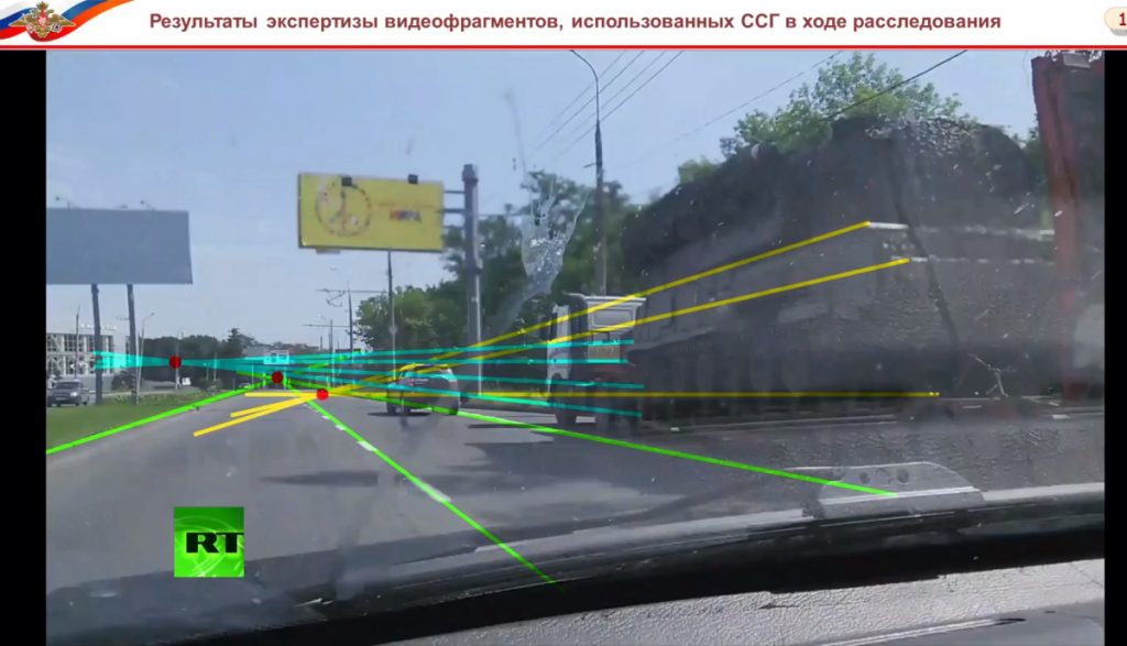 - Предъявляя доказательства фальсификации фото- и видеоматериалов, использованных Международной группой в качестве доказательства причастности России к преступлению, Минобороны заявило, что часть снимков и записей противоречит закону линейной перспективы. Как рассказали в ведомстве, по этому закону, который известен художникам еще с XIV века, все удаляющиеся вглубь изображения горизонтальные линии должны встречаться в точке схода на горизонте, а это наблюдается не на всех видео и фото Международной группы. По мнению ведомства, грузовик с «Буком» на них не присутствовал изначально и был добавлен позднее. Ведомство представило и другие нестыковки — например, на одном из видео «Бук» движется задним ходом, что свидетельствует о фальсификации видеозаписи.