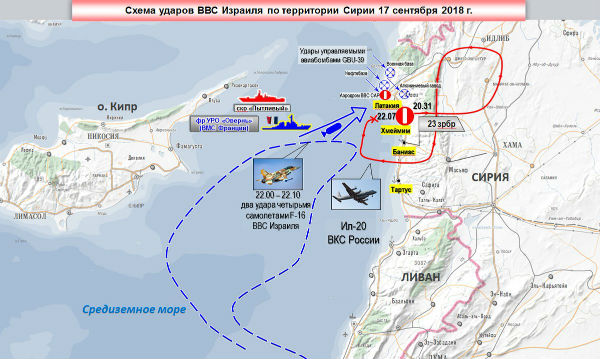 Самолет радиоэлектронной разведки Ил-20 пропал с радаров в понедельник около 23 часов при возвращении на авиабазу Хмеймим. В это время он летел над Средиземным морем в 25 километрах от берега. В первом сообщении Минобороны подчеркивалось, что это произошло во время атаки четырех израильских самолетов F-16 и одновременно с пусками ракет с находившегося в том же районе французского фрегата "Овернь". В Париже катеогорически отвергли причастность французских вооруженных сил к гибели самолета.