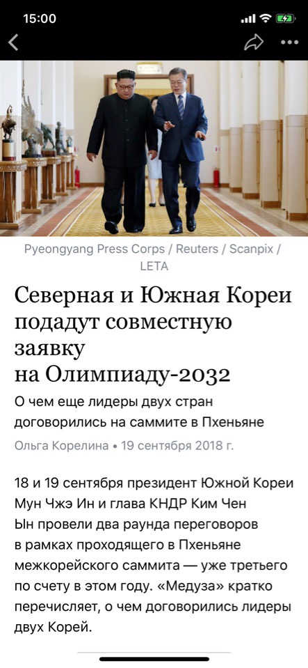 Северная и Южная Кореи договорились подать заявку на совместную Олимпиаду в 2032 году. Кроме того, лидеры враждующих братских государств пообещали сократить число пограничных постов и создать центр встреч для разделенных семей.