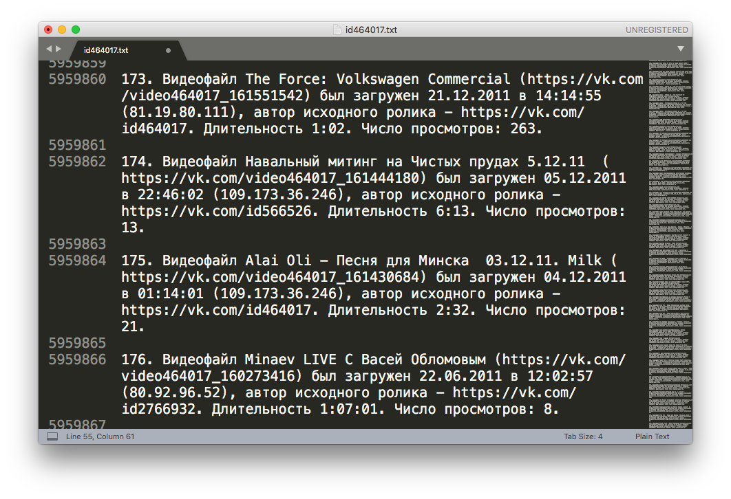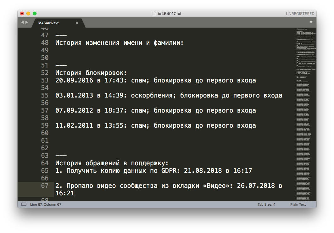 В архиве оказался один текстовый файл размером 178 мегабайт — в нем было почти шесть миллионов строк, содержавших сразу все наборы данных: от изменения прикрепленных номеров телефона до личных сообщений и записей на стене.