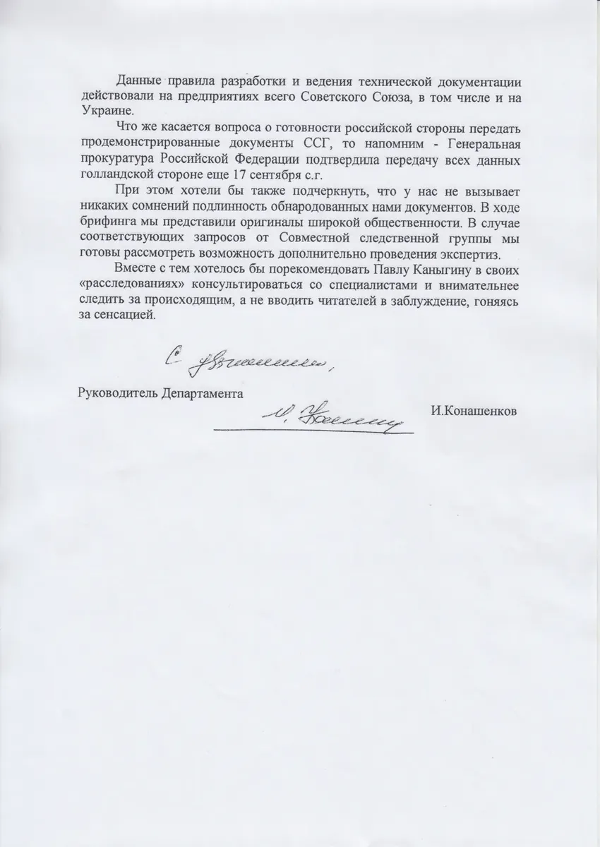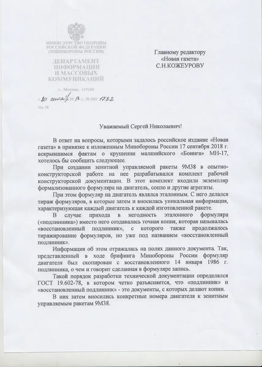 Минобороны РФ ответило на вопросы «Новой газеты» о нестыковках в документе на ракетный двигатель ЗРК «Бук». Документ, по мнению военных, является «неопровержимым доказательством» непричастности российских военных к трагедии MH17. В ведомстве подтвердили, что считают предъявленные бумаги подлинными и сослались на порядок хранения, учета и копирования документации, описанном в ГОСТе СССР 19.602-78.