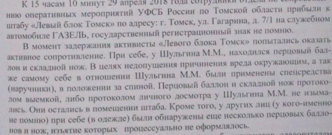 «Анализируя собранные в ходе проверки доказательства, следует прийти к выводу, что сотрудники УФСБ <…> действовали в рамках закона, — сказано в постановлении об отказе в возбуждении уголовного дела. — Перед задержанием Шульгина М.М. они представились, применили специальные средства и физическую силу в связи с тем, что последний оказывал сопротивление и создавал угрозу жизни и здоровью граждан, сотрудников органов федеральной службы безопасности (выражался нецензурной бранью, бился головой об дверь автомобиля т.д.). Кроме того, как следует из объяснений сотрудников УФСБ России по Томской области физическое насилие в отношении Шульгина М.М. они не применяли. Они допускают, что при фиксации Шульгина М.М. на полу автомобиля, последний случайно задел тумблер (кнопку включения) печки, и она стала работать. Печка работает беззвучно, в связи чем они даже не подозревали, что она включена»