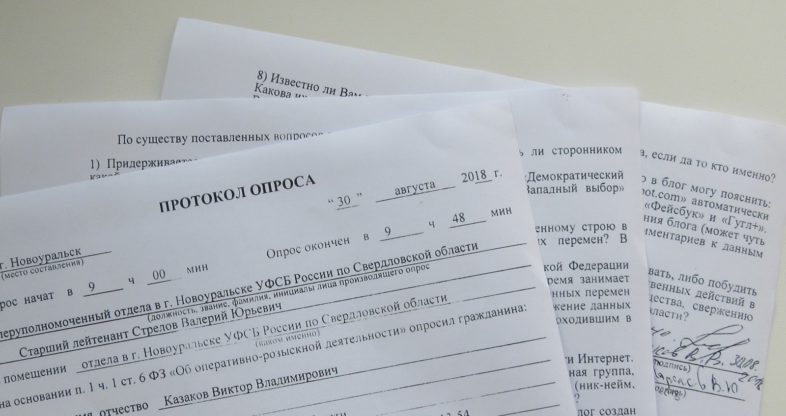 Виктор Казаков, автор блога «Новоуральское свободное слово» в социальной сети Google+, который он ведет c 2013 года, привлек своими публикациями внимание местного подразделения ФСБ. 30 августа он был приглашен по телефону в отдел этой структуры в своем городе. В ходе опроса выяснилось, что предметом интереса оперуполномоченного в Новоуральске УФСБ по Свердловской области старшего лейтенанта Валерия Стрелкова служит блог Виктора Казакова, который в опроснике почему-то фигурировал как «сообщество «Новоуральское свободное слово». Как подчеркивает сам Казаков, в действительности никакого сообщества нет, а есть только личный авторский блог, где пишет только он сам, высказывая свое мнение по актуальным вопросам.