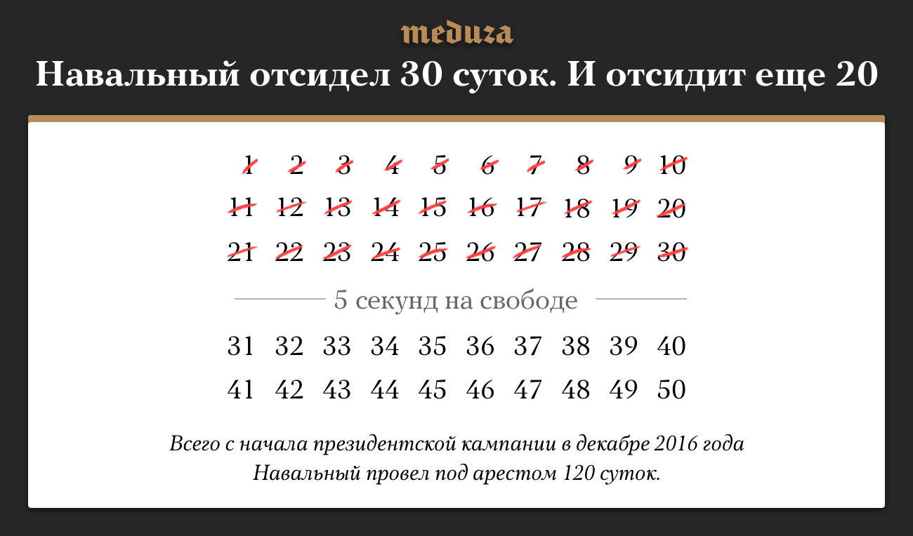 Сколько времени Навальный проводит под арестом, а сколько — на свободе. В одной картинке