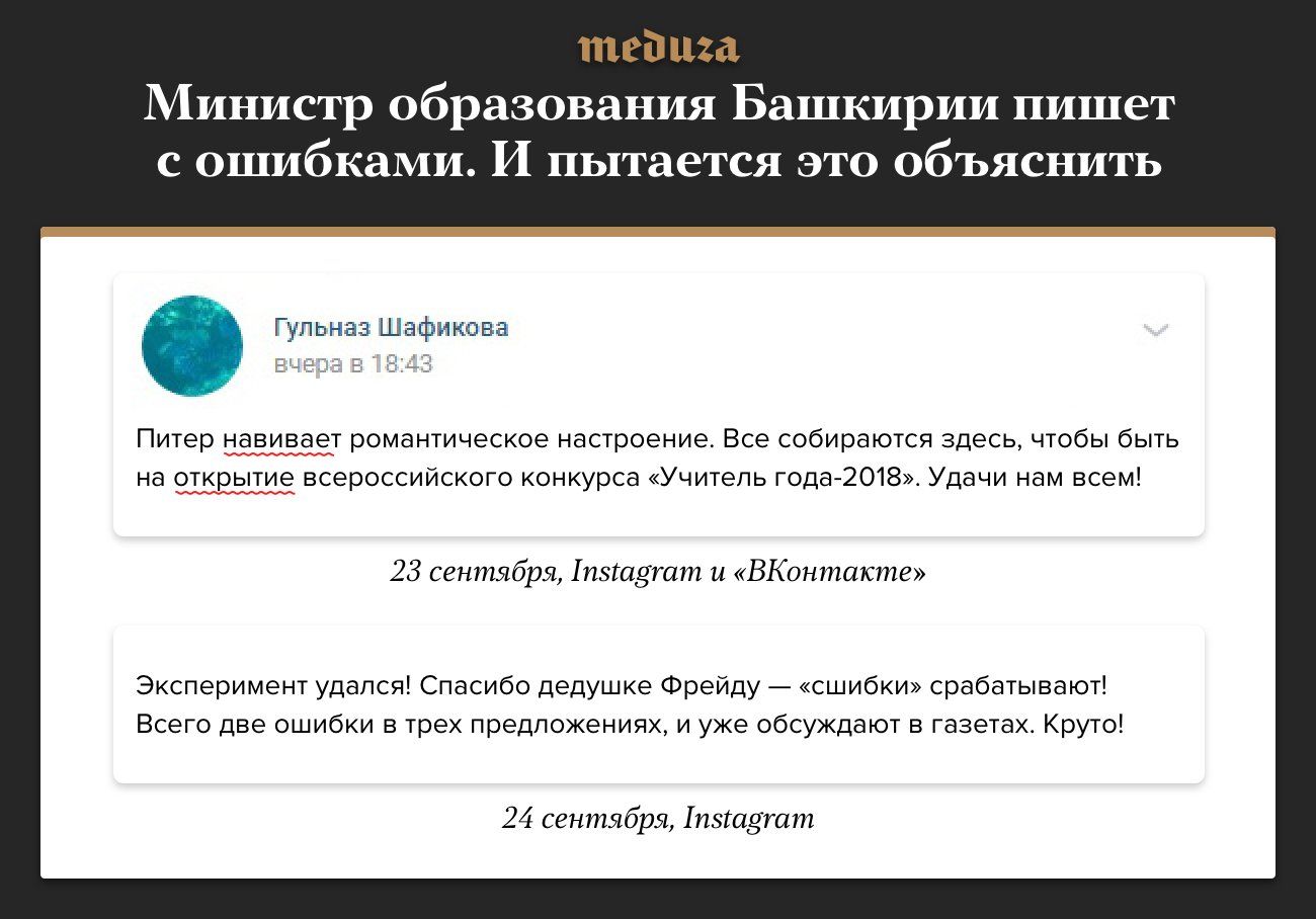 Что нужно знать о состоянии образования в России — в одной картинке. Министр образования Башкирии Гульназ Шафикова 23 сентября опубликовала в «ВК» и инстаграме пост о своей поездке в Петербург, а затем, когда неблагодарные (но грамотные) подписчики заподозрили неладное (джве ошибки в одном предложении!), попыталась стремительно переобуться. Получилось не слишком убедительно.