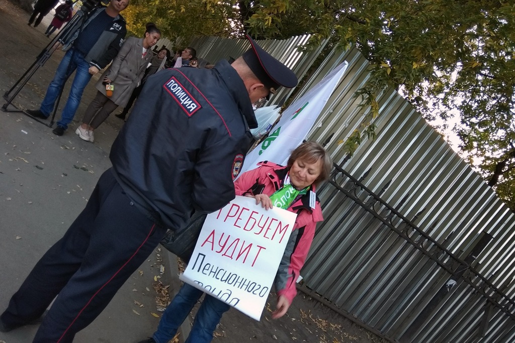 Два человека, которые протестовали против здания ПФР, были вынуждены свернуть плакаты. Полицейские посчитали, что их содержание не соответствовало заявленной теме пикета.
