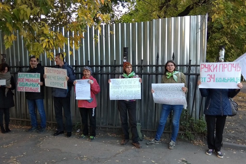 Территорию, огороженную кованным забором, дополнительно ограничили металлопрофилем. Против застройки протестовали восемь человек. Они пришли с плакатами: «Достроить лечебный корпус», «Лечат и спасают жизни в больнице, а не в Ленте», «Деревьев все меньше, больных всё больше».