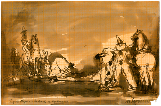 В самом деле, с одной стороны — автор острых, колючих и драматических рисунков из цикла «Страсти»; человек, находившийся все время на грани выживания, питавшийся от случая к случаю, как говорят в народе, чем Бог послал, никогда не имевший постоянного пристанища, своего угла; художник, вечно боровшийся не за мирские блага, а просто за возможность заниматься творчеством, написавший о себе: «…жизнь для меня была мачехой, и мачехой злой и беспощадной. Все, что мне удалось “урвать” у нее, всегда с какой затратой энергии и сил!» [1] А с другой — одинокий мечтатель, воспринимающий мир через определенные эстетические традиции; романтик, изображающий бесконечные портреты прекрасных дам, нездешних всадников и наездниц.