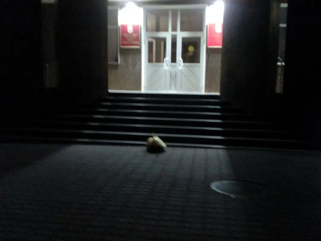 Из подъезда с пакетом в руках выходит мужчина лет пятидесяти. Подходит к горе, закидывает свой пакет наверх и удаляется быстрым шагом.