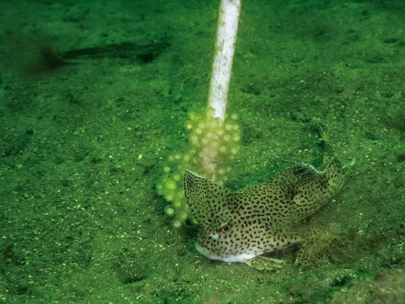 Несколько месяцев назад водолазы разместили эти столбики на дне в пяти местах, где, согласно предыдущим исследованиям, метали икру Brachionichthys hirsutus. В сентябре наступила пора нереста. Как сообщает биолог Алекс Хорманн (Alex Hormann) лично проверявший искусственные нерестилища, рыбы приняли замену. Только за одно погружения он насчитал девять кладок. По словам Хорманна, каждая самка откладывает от 80 до 120 икринок. Оплодотворенные икринки, склеенные друг с другом, закрепляются у основания асцидии (или, в данном случае, керамического столбика), и самка не менее пяти недель охраняет кладку от хищников.