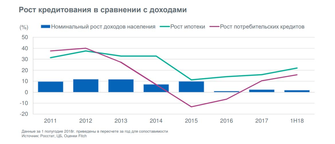 - 2018-й стал годом быстрого роста потребительского кредитования — долги россиян растут в разы быстрее, чем доходы. Если в 2015 году доходы населения выросли на 10%, объем выданной ипотеки — на чуть более 10%, а объем потребительских кредитов сократился на чуть более 10%, то в 2018 году при повышении доходов примерно на 2% рост ипотеки составил чуть более 20%, а потребительских кредитов — более 15%.
