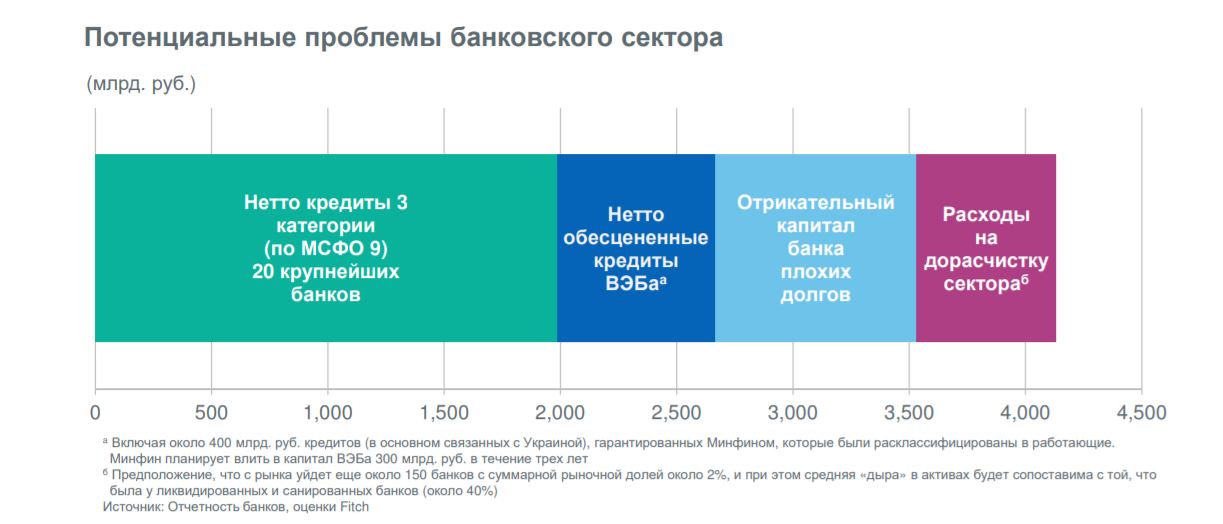 - Fitch оценивает объем потенциальных проблем российского банковского сектора банков в более 4 трлн рублей.
