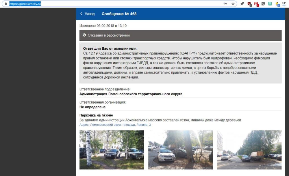 В новости от 28 августа 2018 года администрация Архангельска декларирует, что через систему Чистый город появилась возможность обратить внимание на парковки на газоне.