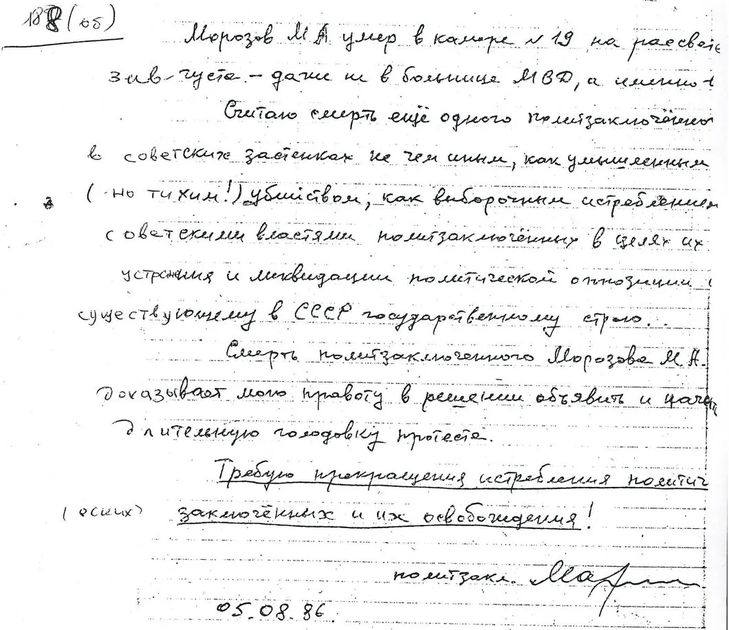 Под видом прочистки шланга мне устраивают пытки, массажируя и дергая шланг, не вынимая его из моего желудка», — описывал он процесс кормления, жалуясь генеральному прокурору СССР с требованием прекратить пытки.