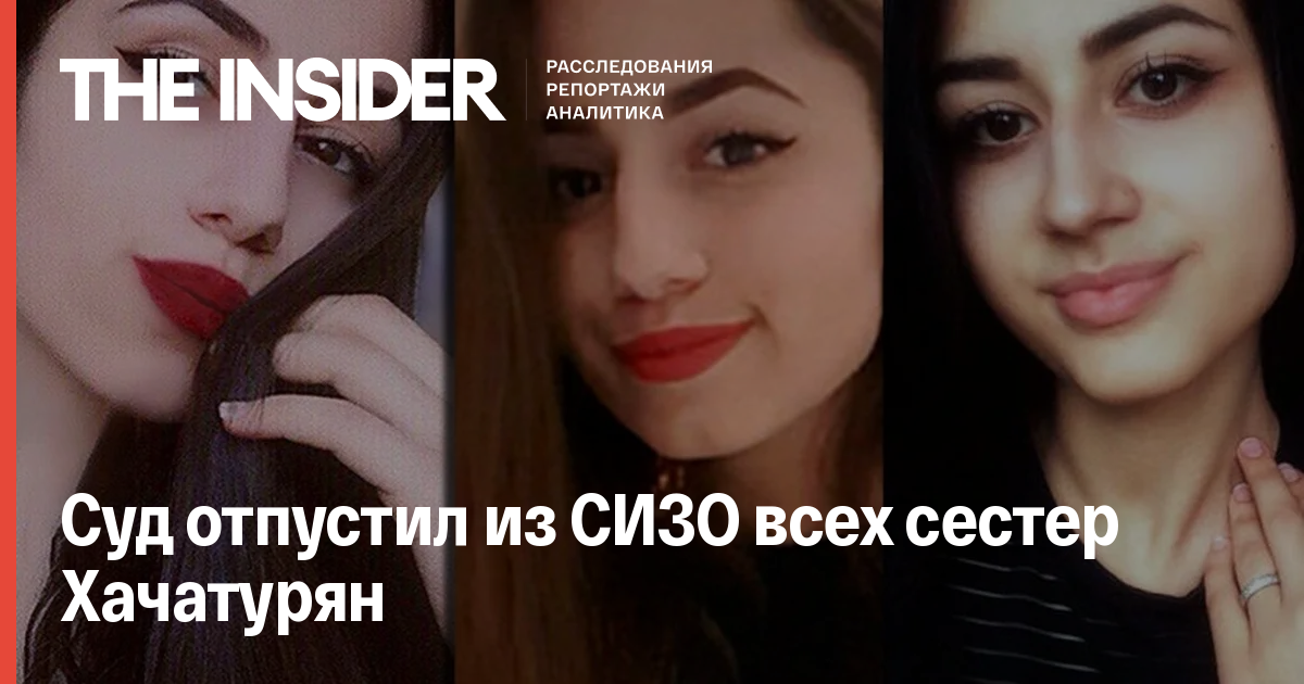 Басманный суд Москвы отпустил из СИЗО всех сестер Хачатурян, обвиняемых в убийстве своего отца, сообщает «Дождь». Вслед за средней из сестер – Ангелиной суд отпустил 17-летнюю Марию и 19-летнюю Кристину.