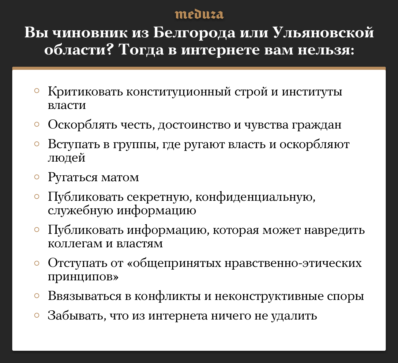 Администрация Белгорода требует от муниципальных служащих не публиковать, «в том числе посредством репоста, „лайков“ и т. п.», материалы с критикой конституционного строя и институтов власти, а также оскорбляющие честь, достоинство и чувства граждан. Чиновники должны воздерживаться от высказываний (в том числе в интернете и во внерабочее время), способных нанести ущерб своей репутации и авторитету администрации города, «избегать конфликтов, неконструктивных споров с другими пользователями онлайн-сервисов». Их также призывают помнить, что публикации «формируют впечатление об органах местного самоуправления» Белгорода, и что информация в интернете, «как правило, не может быть удалена».