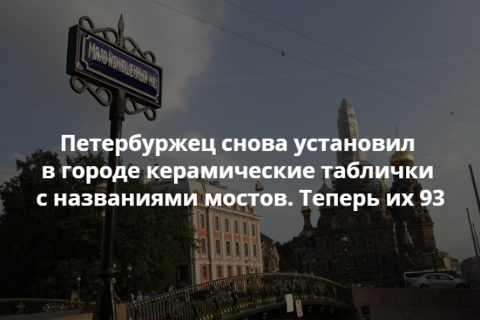Петербургский художник Юрий Осинин снова установил в Петербурге керамические таблички с названиями мостов. Он, как и в прошлый раз, сделал их самостоятельно. По его словам, теперь в городе 93 таблички.