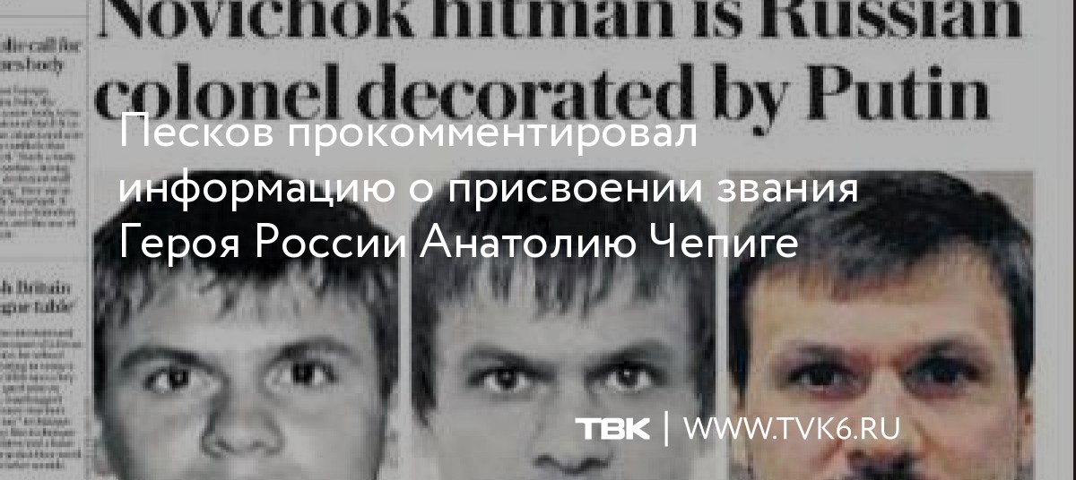 Пресс-секретарь президента РФ Дмитрий Песков отрицает присвоение полковнику ГРУ Анатолию Чепиге звания Героя России, пишет Meduza.