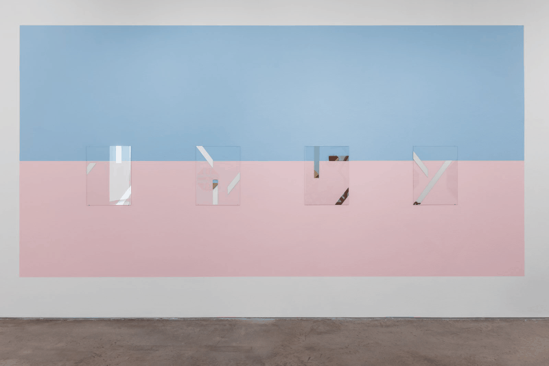 Цветопространственная инициатива (Хьюстон) #1 (2018) и COEV композиции #13, 14, 8, 6 (2016). 261х522 см. Эмаль, акрил, зеркальное стекло (4 листа 45x60 см)