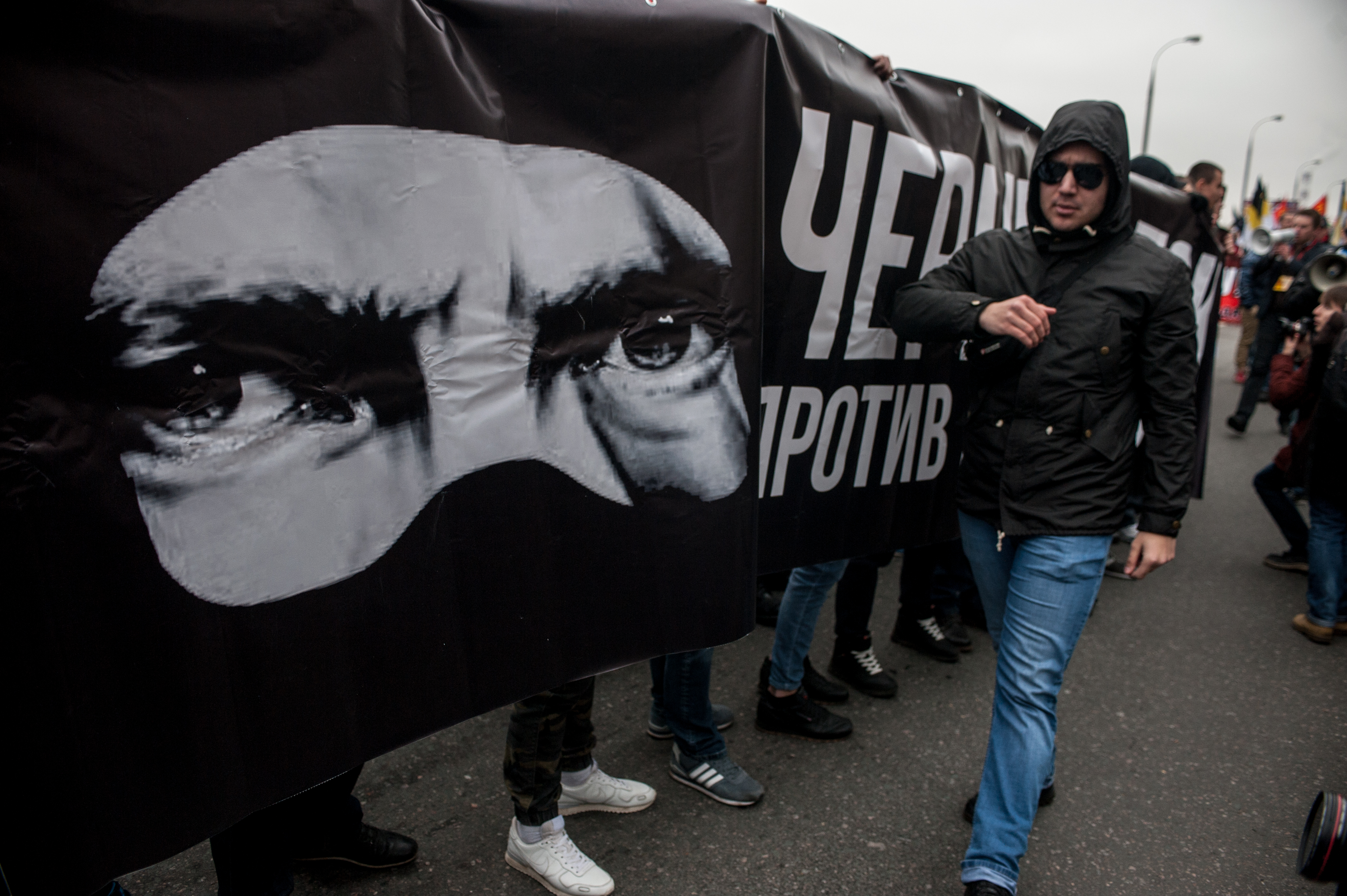 Владимир Ратников на фоне колонны «Черного блока» на «Русском марше» в 2016 году. Фото: Артур Новосильцевв / ТАСС