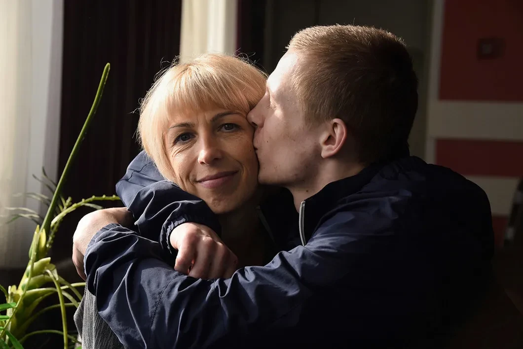 Евгений Макаров целует маму. Фото: Виктория Одиссонова / «Новая газета»