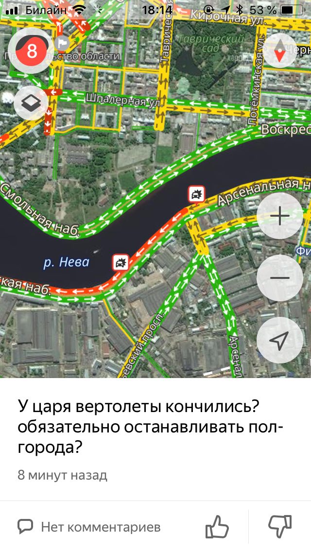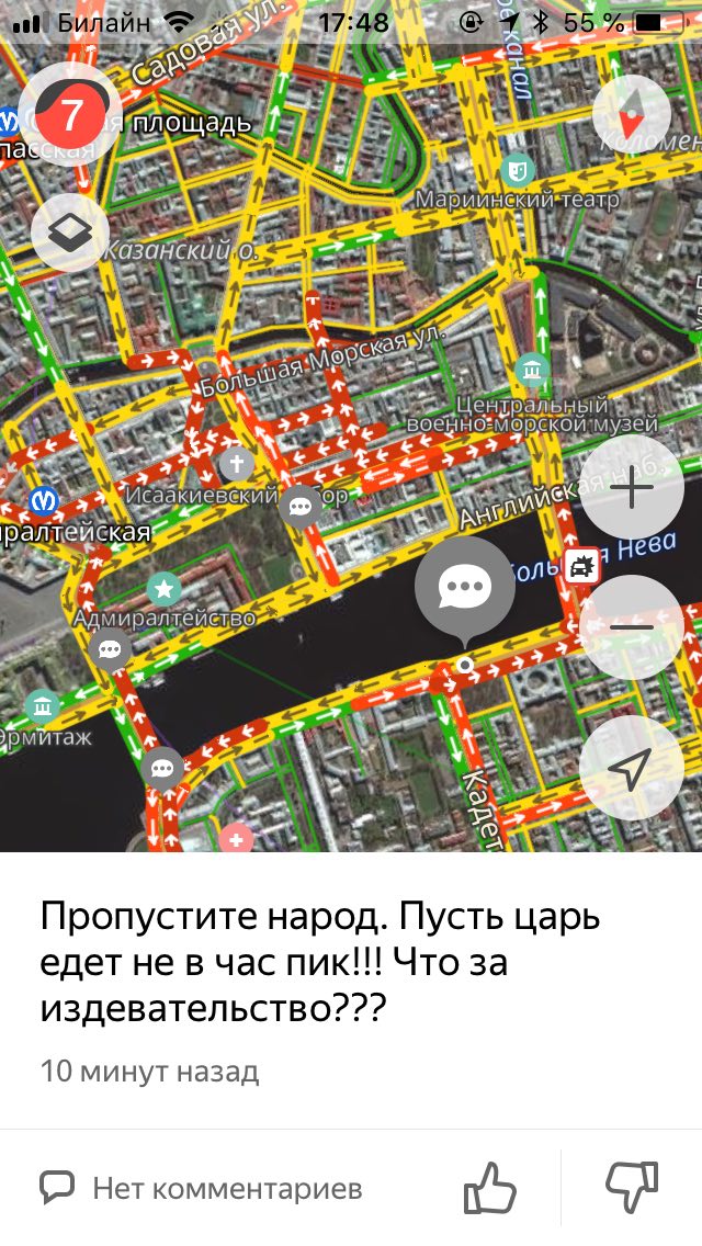 Водители жалуются на то, что дороги перекрыты по всему Петербургу. Это, вероятно, связано с приездом президента Владимира Путина. 2 октября стало известно, что Зимний дворец закроют ради встречи Путина и канцлера Австрии Себастьяна Курца. Встреча запланирована на вечер 3 октября.