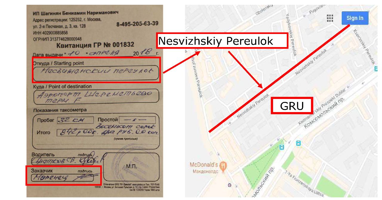 - У Моренца в числе прочего была изъята квитанция на такси, из которой следует, что он добирался в аэропорт «Шереметьево» от Хамовнических казарм, где располагается комплекс зданий Минобороны, используемый, в числе прочих «кибервойсками» ГРУ.