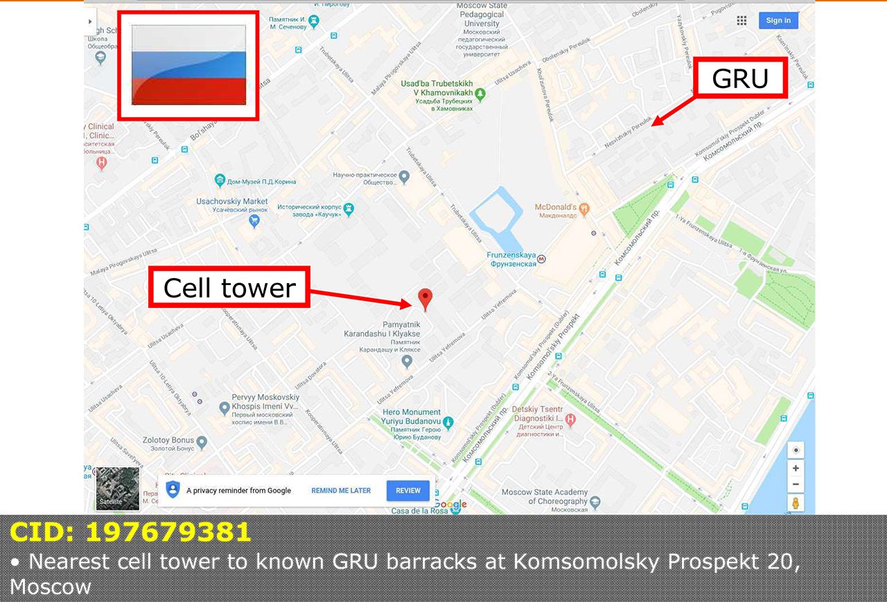 Один из обнаруженных у россиян телефонов, как выяснилось в ходе расследования, Sony Xperia — 9 апреля находился на Комсомольском проспекте около Хамовнических казарм — комплекса зданий Минобороны, используемого, в числе прочих ГРУ, а точнее ее «кибервойсками» (адрес упоминается в нескольких расследованиях).