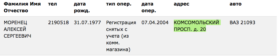В базах данных можно найти информацию об автомобиле, принадлежавшем Алексею Моренцу (также совпадают отчество и дата рождения с указанными в диппаспорте), зарегистрированному в Москве по адресу: Комсомольский проспект, 20. В том же комплексе Хамовнических казарм!