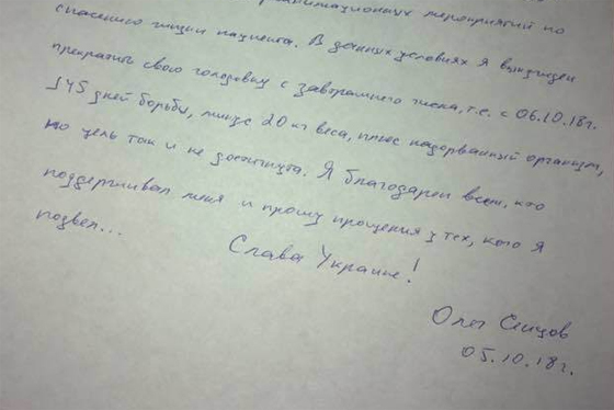 «В связи с критическим состоянием моего здоровья, а также начавшимися патологическими изменениями во внутренних органах, в самое ближайшее время ко мне запланировано применение принудительного питания. Мое мнение при этом уже не учитывается. Якобы я уже не в состоянии адекватно оценивать уровень здоровья и опасности ему грозящей. Насильственное кормление будет проводиться в рамках реанимационных мероприятий по спасению жизни пациента. В данных условиях я вынужден прекратить свою голодовку с завтрашнего дня, то есть с 6.10.18.