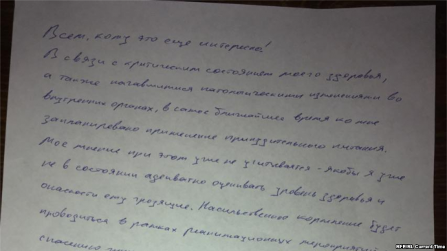 «В связи с критическим моего здоровья, а также начавшимися патологическими изменениями во внутренних органах, в самое ближайшее время ко мне запланировано применение принудительного питания. Мое мнение при этом уже не учитывается — якобы я уже не в состоянии адекватно оценивать уровень здоровья и опасности ему грозящие.