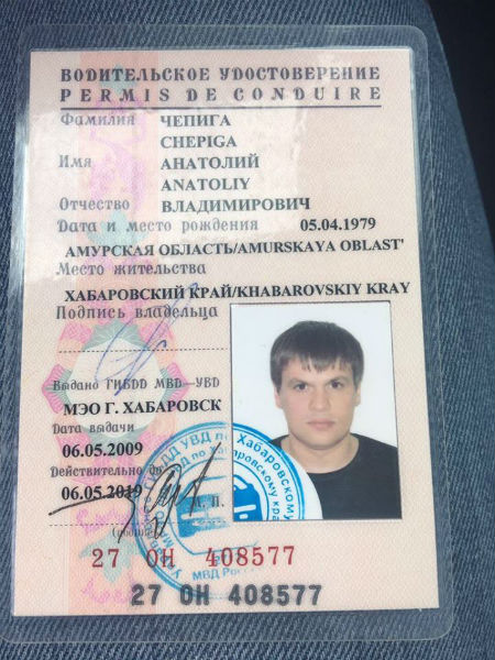 Водительское удостоверение выдано Чепиге в Хабаровске 6 мая 2009 года, оно действительно до 6 мая 2019 года.