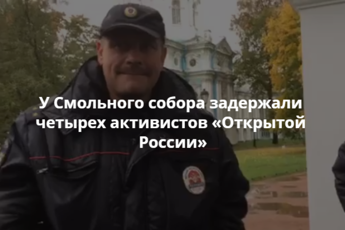 В Петербурге у Смольного собора задержали четверых активистов «Открытой России» Павела Чупрунова, Александру Бруссер, Александра Федосеева и Андрея Никитина. У них были с собой маски с изображением лица президента России Владимира Путина, но они отрицают, что надевали их.