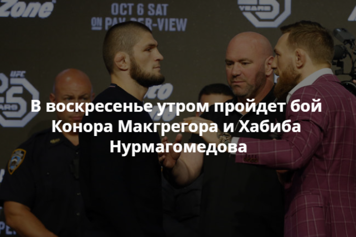 Поединок Конора Макгрегора и Хабиба Нурмагомедова пройдет в рамках турнира UFC 229. Он начнется в 5:00 утра по московскому времени. Макгрегор и Нурмагомедов выйдут в клетку приблизительно в 7:30.