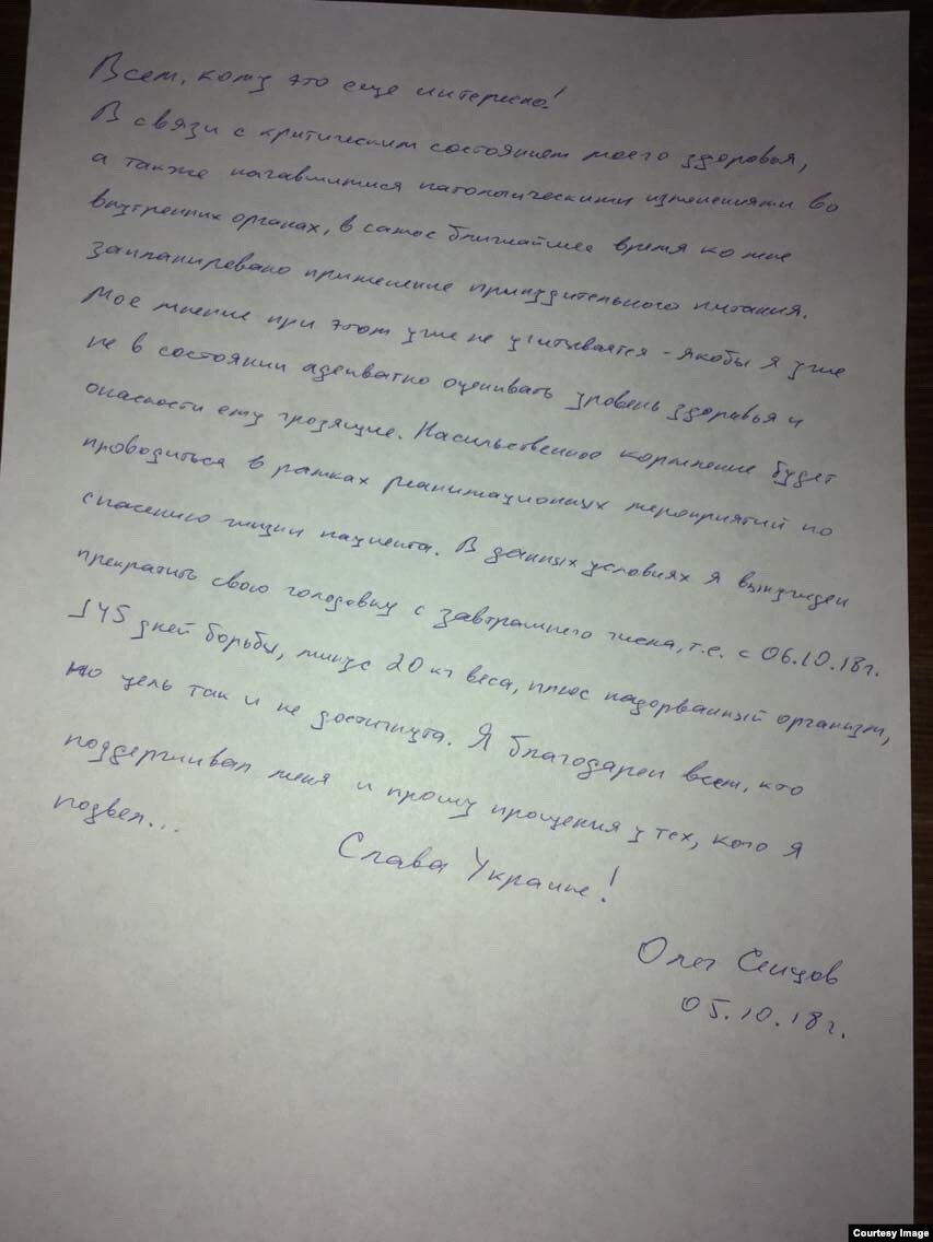 В заявлении режиссер говорит, его планировали перевести на принудительное питание в связи с критическим состоянием его организма и начавшимися патологическими изменениями внутренних органов.