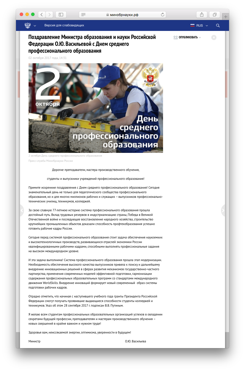 А вот Общероссийский профсоюз образования более творчески подошел к поздравлениям и убрал фразу о «выполнимой задаче», а слова «на высоком международном уровне» заменил на «высоком уровне по стандартам международного движения WorldSkills».