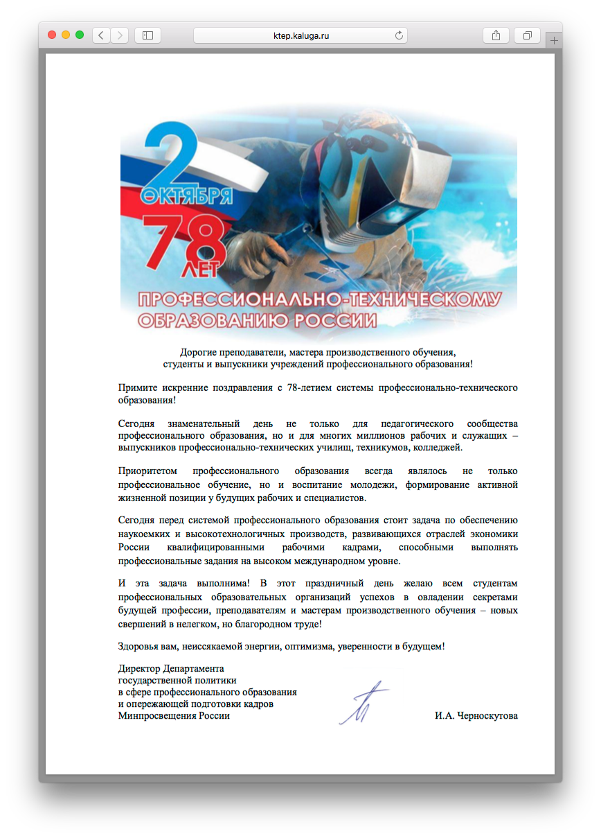Судя по всему, само Минобразования снова использовало тот же текст в поздравлении с Днем профессионального образования в 2018 году, но опубликовало его от имени чиновника рангом ниже — главы департамента государственной политики в сфере подготовки рабочих кадров и ДПО Минобразования Инны Черноскутовой. Копию письма Черноскутовой публикует на своем сайте Калужский техникум электронных приборов.