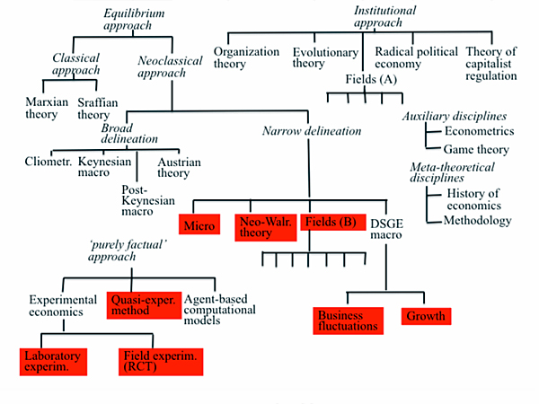 В схематическом виде «анатомия» современной экономической науки представлена на рис. 1. «Мейнстримные» ячейки закрашены на нем красным цветом. Внутри самого мейнстрима просматриваются два больших блока: условно – «неоклассический» (микроэкономика, неовальрасианский анализ, теория цикла, теория роста, различные прикладные субдисциплины) и условно – «атеоретический» (лабораторные эксперименты, полевые эксперименты, квази-экспериментальные исследования). На месте авторов я бы, наверное, закрасил красным цветом еще три ячейки – для эконометрики, теории игр и клиометрики (экономической истории). Но и без всяких добавок видно, насколько велика степень внутренней неоднородности того, что называют экономическим мейнстримом: сегодня он предстает как конгломерат разнородных исследовательских программ, объединенных лишь некими общими нормативными представлениями о том, что такое «хорошая наука».