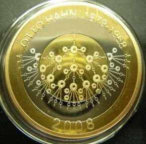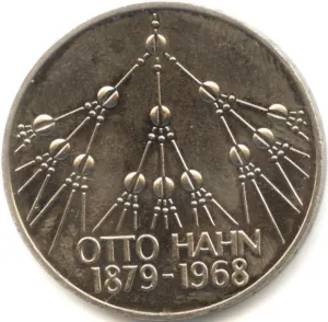 В 1979 году в ФРГ была выпущена тиражом 5 млн экз. монета (медно-никелевый сплав, покрытый никелем) номиналом 5 марок, посвященная 100-летию со дня рождения немецкого физика и радиохимика Отто Гана (1879–1968). Ган открыл химический элемент протактиний (совместно с Лизе Мейтнер), ядерную изомерию у радиоактивных элементов. Но главное его открытие (совместно с немецким физиком Фрицем Штрассманом) — реакция деления урана под действием медленных нейтронов (1939 год). Это открытие стало первым шагом к практическому использованию ядерной энергии. В ноябре 1945 года Гану была присуждена Нобелевская премия по химии за 1944 год «за открытие деления ядер тяжелых атомов» (опоздание связано с тем, что в 1940–1943 годах Нобелевские премии не присуждались). На монете — схематическое изображение цепной реакции деления ядер урана (рис. 3). Аналогичный рисунок — на биметаллической монете Сомали номиналом 250 шиллингов, выпущенной в 2008 году (рис. 4). В Сомали в том же году и с тем же номиналом была выпущена монета, посвященная 100-летию со дня рождения Джона Бардина (рис. 5). В 1956 году Бардин получил Нобелевскую премию по физике (совместно с У. Шокли и У. Браттейном) за изобретение транзистора; без химии создание полупроводников было бы невозможно. На монете изображена электронная схема транзистора: C — collector (коллектор), E — emitter (эмиттер), B — base (база).