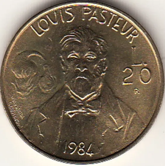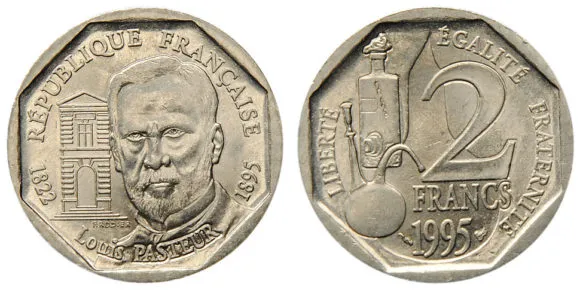 В 1995 году во Франции были выпущены две монеты с одинаковым рисунком (рис. 9), посвященные 100-летию со дня смерти французского химика и микробиолога Луи Пастера (1822–1895): 2 франка из никеля (тираж 9,975 млн) и серебряные (Ag-900) 100 франков (тираж 10 тыс. экз.). Пастеру впервые удалось разделить два оптических изомера органического соединения — виноградной кислоты. Он установил, что микроорганизмы способны усваивать только одну форму оптических изомеров. Пастер изучал различные формы брожения: спиртовое, уксусное и др. Он создал метод пастеризации, т. е. предохранения пищевых продуктов от порчи, доказал невозможность так называемого самозарождения живых существ, разработал учение об искусственном иммунитете и ввел в практику систему прививок и вакцинаций против инфекционных заболеваний.