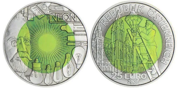 Ауэру посвящены две австрийские монеты (рис. 7 и 8). Его портрет изображен на серебряной (Ag-800) монете номиналом 25 шиллингов, выпущенной в 1958 году тиражом 4,999 млн экз. к 100-летию со дня рождения ученого. А в 2008 году к 150-летию со дня рождения Ауэра была выпушена тиражом 65 тыс. экз. биметаллическая монета номиналом 25 евро с сердцевиной из анодированного ниобия (отсюда его зеленый цвет) и с ободом из серебра (Ag-900). Изображения на монете прослеживают историю освещения.