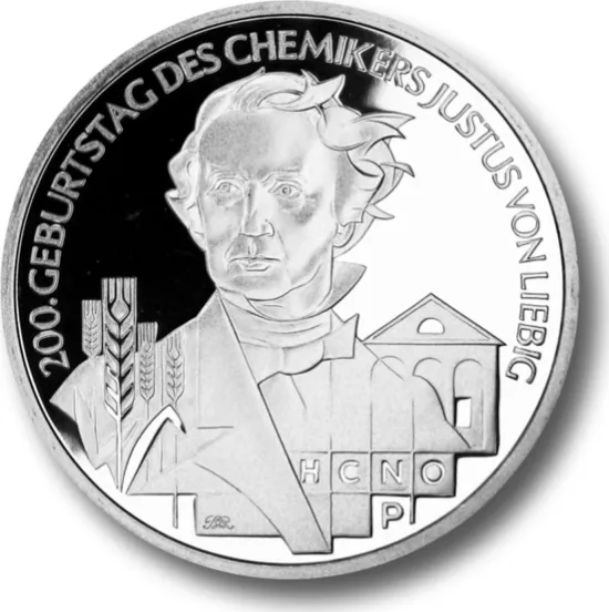 В ФРГ монету в честь Либиха выпустили в 2003 году, к 200-летию со дня его рождения (Ag-925, 10 евро, рис. 2). Ее тираж 2,05 млн экз., в том числе 350 тыс. экз. качества proof. Либих — один из основоположников органической химии. Ему принадлежит открытие изомерии (совместно с Вёлером). На монете — формула гремучей (фульминовой) кислоты HCNО, изомера циановой кислоты HOCN (Либих получил их серебряные соли), а также символ фосфора; как выяснил Либих, фосфор необходим растениям для питания, наряду с азотом и калием. Либих впервые синтезировал многие органические соединения, создал теорию многоосновных кислот, заложил основы агрохимии и предложил теорию минерального питания растений, разработал ряд количественных методов анализа и сконструировал для них оригинальные приборы, основал химический журнал, который с 1832 года носит его имя (Liebigs Annalen der Chemie). Важная заслуга Либиха в том, что он создал большую школу химиков; в его образцовой химической лаборатории стажировались и русские химики.