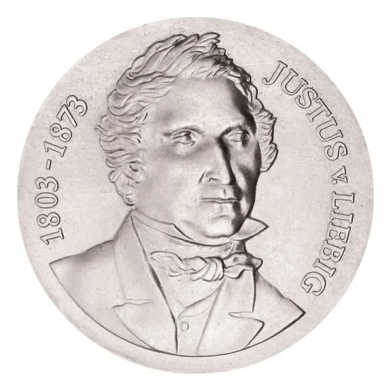 Немецкий химик Юстус фон Либих (1803–1873) — один из самых знаменитых европейских химиков XIX века. Ему были посвящены две серебряные монеты. Первая (Ag-500, 10 марок) была выпущена в ГДР в 1978 году по случаю 175-летия со дня рождения Либиха (рис. 1). Ее тираж — 75,5 тыс. экз., а также 4,5 тыс. экз. качества proof.