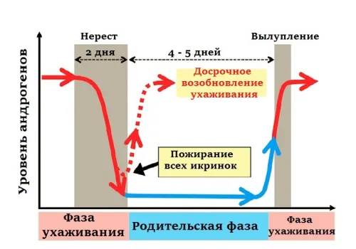 В сезон нереста жизнь самца полосата: в ней чередуются фаза ухаживания и родительская фаза (рис. 2). Период заботы о кладке начинается спустя двое суток после откладывания первой икринки и заканчивается, когда потомство начинает проклевываться. Эти фазы отличаются концентрацией андрогенов: тестостерона и 11-кетотестостерона. В период ухаживания она высока, в период родительской заботы низка, но к концу срока инкубации вновь возрастает.